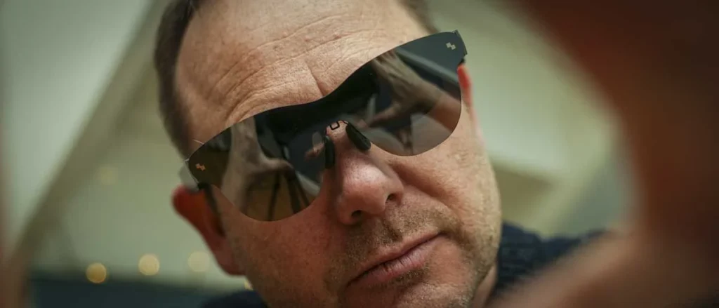 Ao contrário de gerações anteriores, o Air 3s Pro é mais leve e bem acabado. O formato lembra óculos de sol com hastes ligeiramente mais grossas, responsáveis por abrigar botões, eletrônica e a conexão USB-C que se projeta pela parte traseira da haste direita. O acabamento plástico é robusto e o conjunto vem com um estojo compacto para transporte.